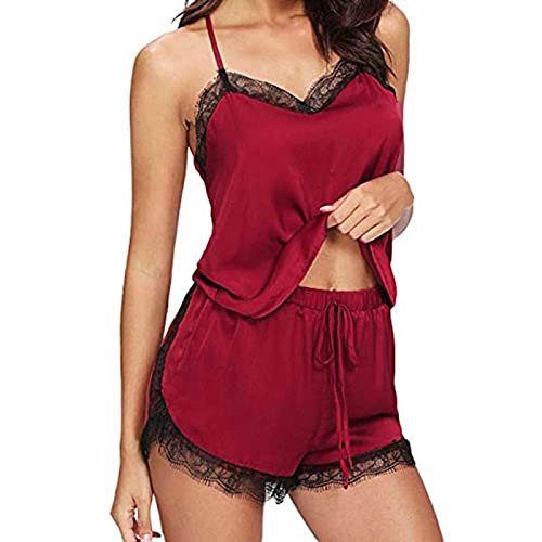 SLOPSS Ladies Pajamas,hot Summer Women Sleepwear Pyjama Sets Sleeveless Spaghetti Strap Lace Trim Silk Satin Cami Top + Shorts Homewear Nightwear Gift,Red,M