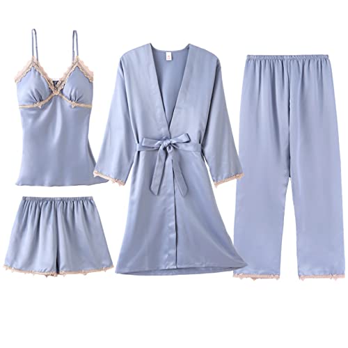 SLOPSS Loungewear For Women Cami And Pants Long Sleeve Sleepwear 4 Piece Pajama Silk Satin Fall Winter Nighties
