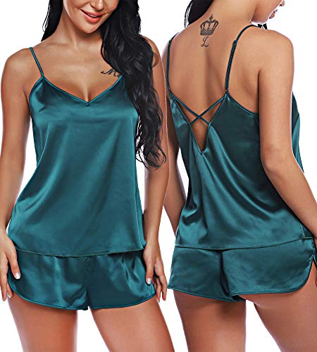WEISSW Womens Satin Pyjamas Set, 2 Piece Silk Sleepwear With Adjustable Straps Sexy Cami Tops Shorts Nightwear Sleeveless Tank Tops Summer Casual Loungewear Green L