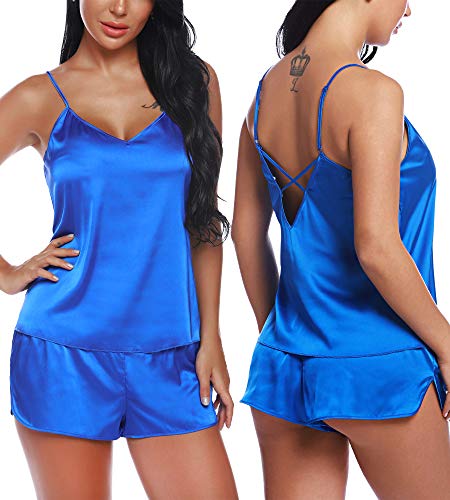 WEISSW Womens Satin Pyjamas Set, 2 Piece Silk Sleepwear With Adjustable Straps Sexy Cami Tops Shorts Nightwear Sleeveless Tank Tops Summer Casual Loungewear Royal Blue Xs