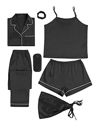 LYANER Women's Pajamas Set 7pcs Silk Satin Sleepwear Loungewear Cami Shirt Pj Set - Black - Small