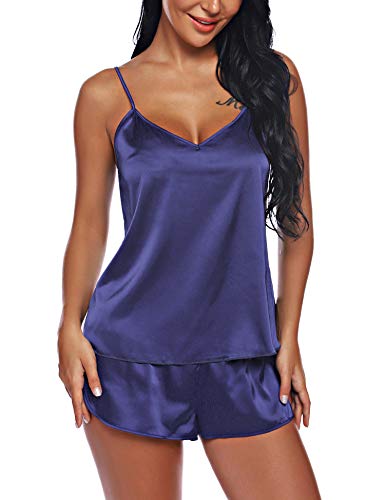 WEISSW Womens Satin Pyjamas Set, 2 Piece Silk Sleepwear With Adjustable Straps Sexy Cami Tops Shorts Nightwear Sleeveless Tank Tops Summer Casual Loungewear Navy Blue M