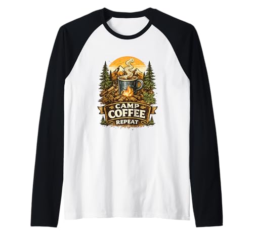 Camp Coffee Repeat Funny Camping Lover Outdoor Adventure Raglan Baseball Tee