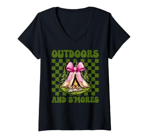 Womens Camping Girl Mom Camper Camp Tent Outdoors and S'Mores V-Neck T-Shirt