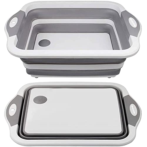 NEWOSTER Collapsible Cutting Board - Multifunction Chopping Board, Basin Drainer & Washing Bowl Dish Tub Draining Plug Kitchen Scissors Portable Drain Basket for Camping, Picnic, BBQ (Gray)