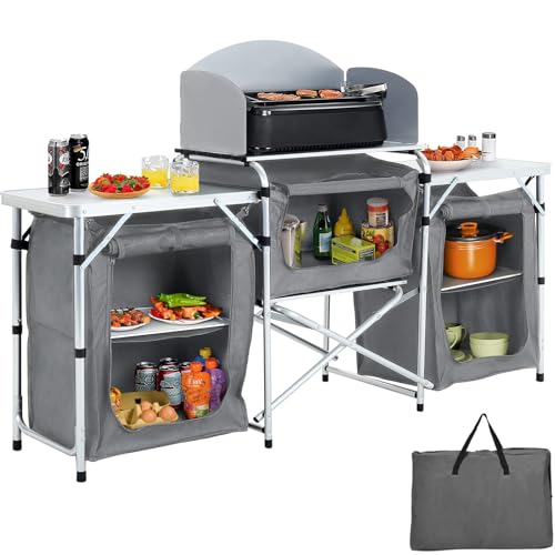 Warmiehomy Folding Camping Storage Unit Portable Camping Kitchen Unit, Camping Cupboard with Aluminium Frame, 3 cupboards+1 panel, Grey, 175×40×110cm