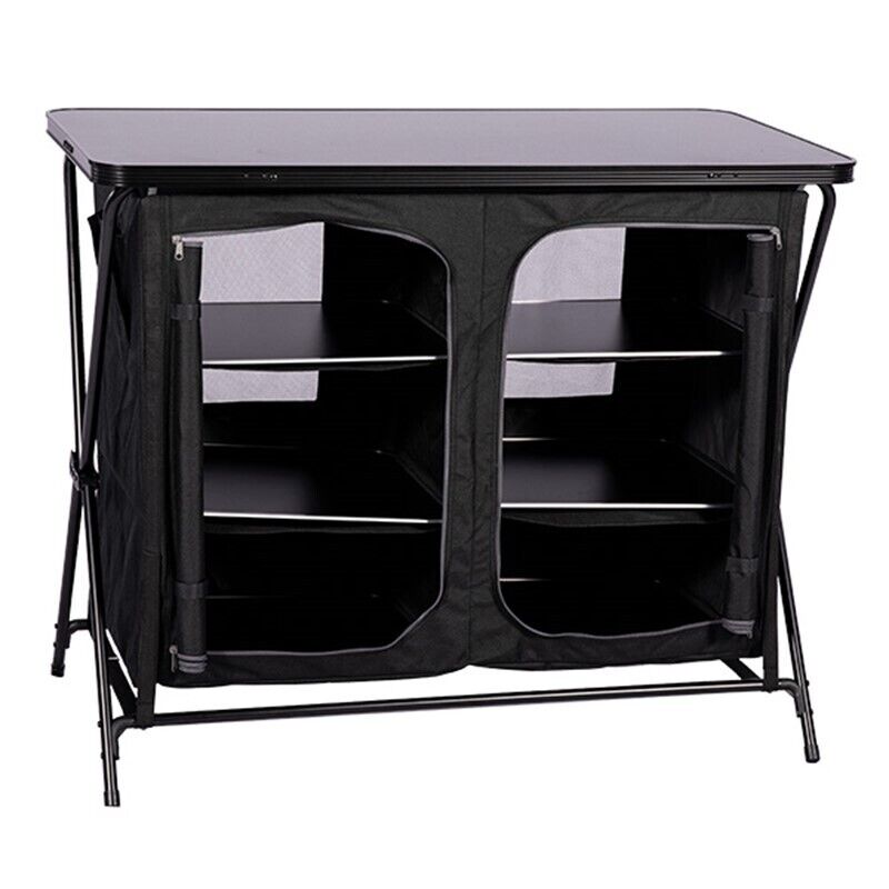 Warmiehomy Folding Camping Storage Cupboard Portable Camping Kitchen Unit Camping Table with Aluminium Frame, 6 Storage Compartments, Black,110x56x88cm