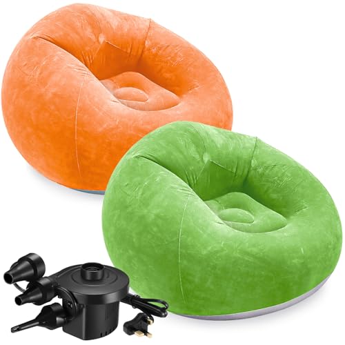 MSYU 2 Pcs Bean Bag Chairs Inflatable Chairs with Electric Air Pump for Adults, Blow up Chair Portable Folding Inflatable Lazy Sofa for Living Room Camping Bedroom (Green, Orange)
