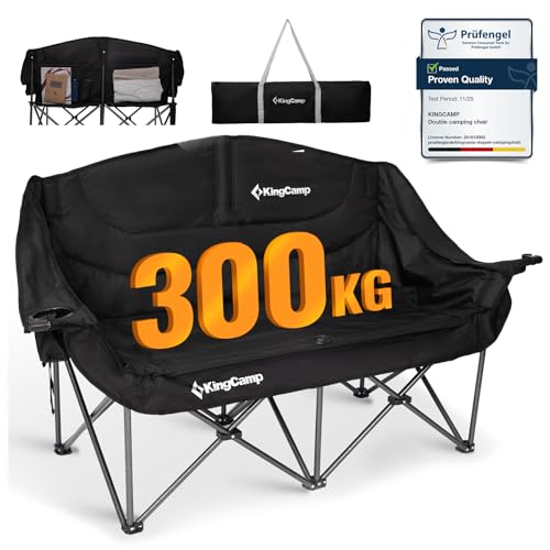KingCamp Larger Double Camping Chair for Adults, Padded Garden Chairs 2 Seater with Armrest & Cup Holder, Folding Oversized Camping Sofa Chair Up to 660 lbs, Outdoor Chairs for Beach Picnic, Black
