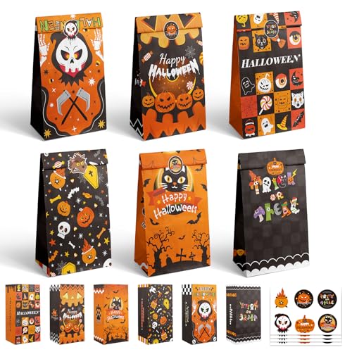 Gcardist 30Pcs Halloween Black-Orange Candy Treat Paper Bags with 30 Stickers 5"x3"x9.5" Mini HWN Party Candy Goodie Snack Bags(12cm×8cm×24cm)