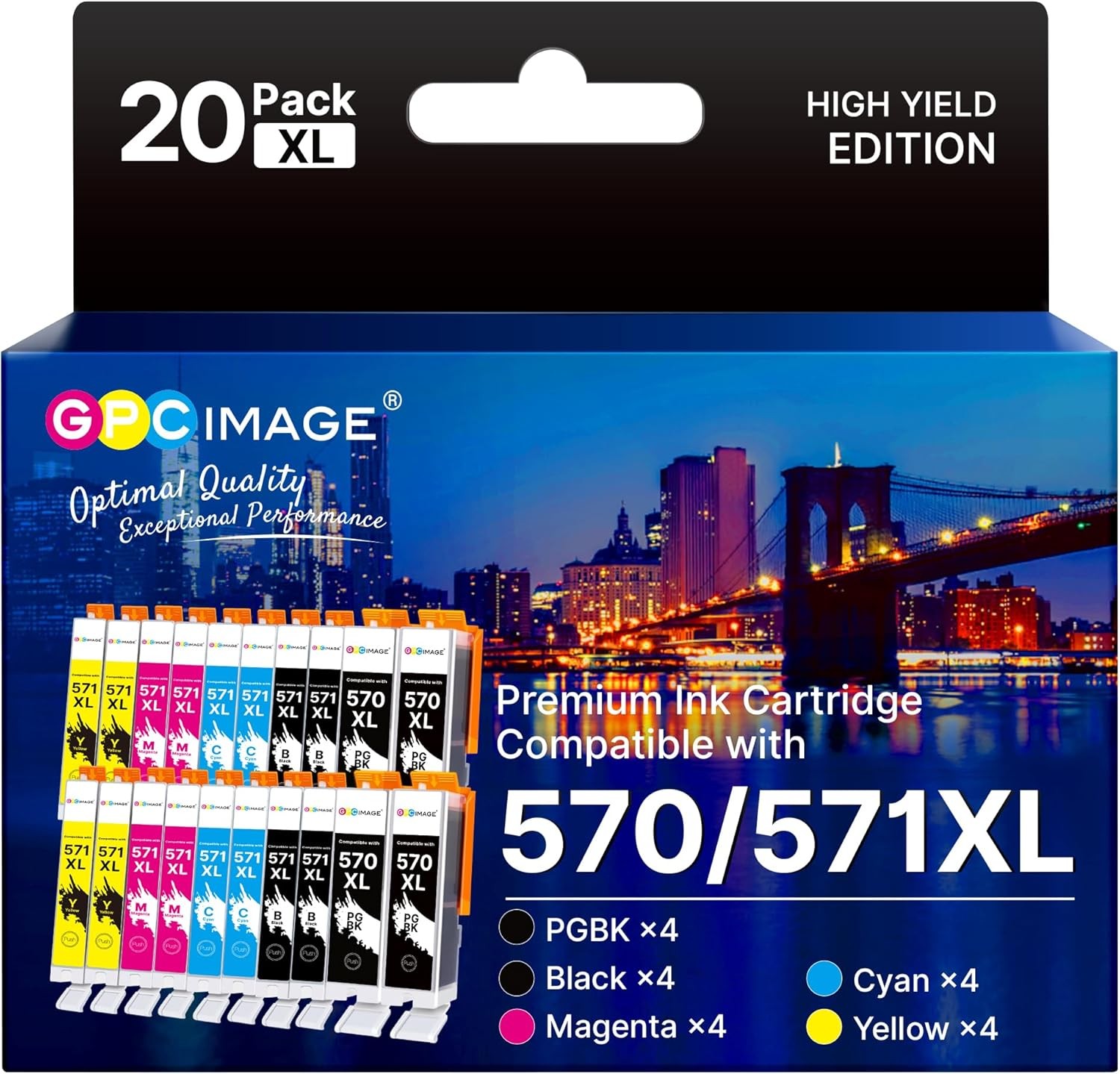 GPC Image 20-Pack 570XL 571XL Ink Cartridges Compatible for Canon 570 571 Ink Cartridges for Canon PIXMA MG5750 MG5751 MG5700 MG5500 TS6050 MG6800 MG6850 MG6851 TS5000 TS5050 (4PGBK/4BK/4C/4M/4Y)
