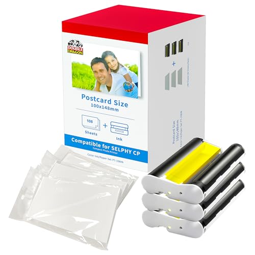 Double Dragon Replacement for Canon Selphy CP1300 KP-108IN Ink and Photo Paper Set | for CP Printer CP1500 CP1300 CP1200 CP1000, 3115B001(AA), 3 Color Ink Cassette + 108 Sheet Paper 100 x 148mm