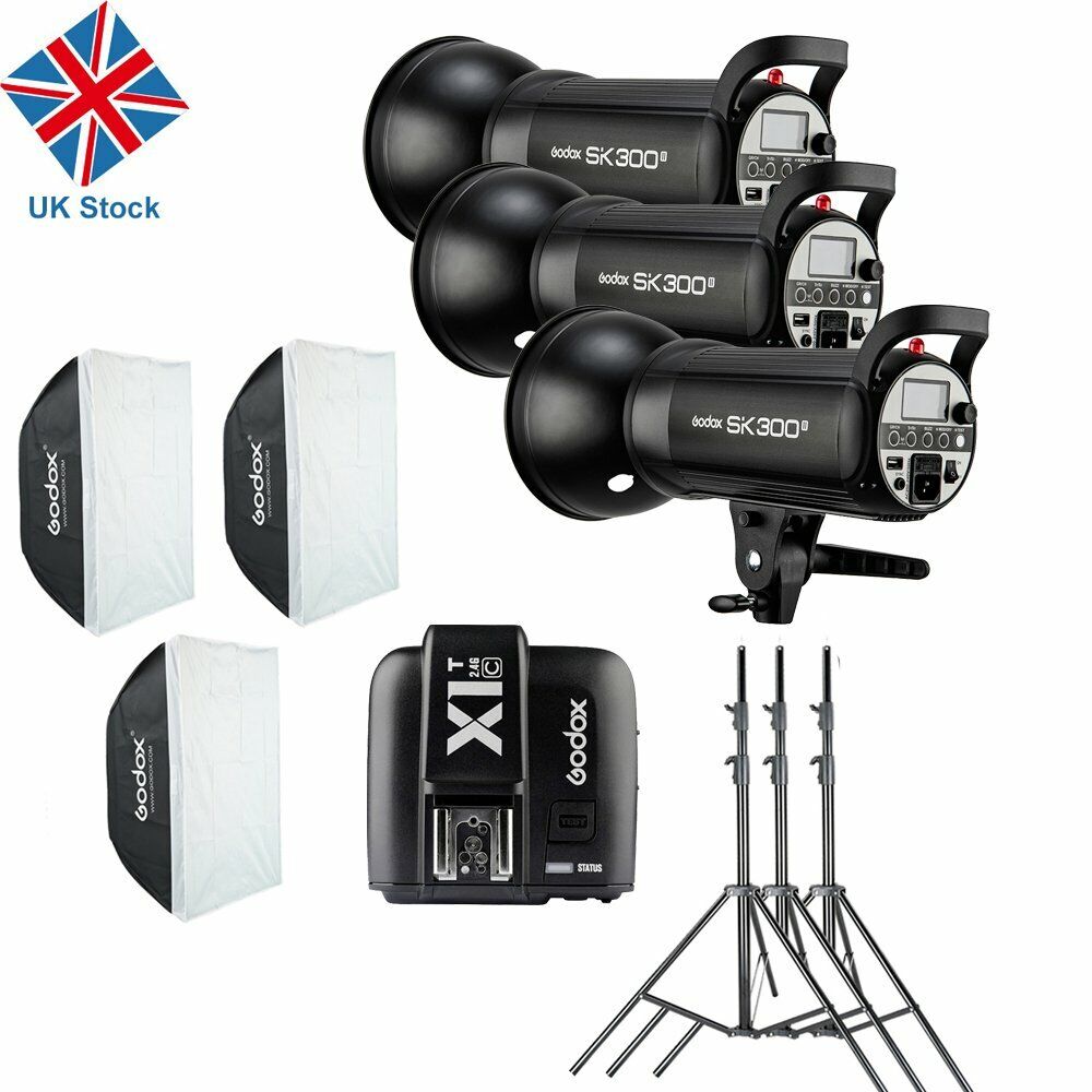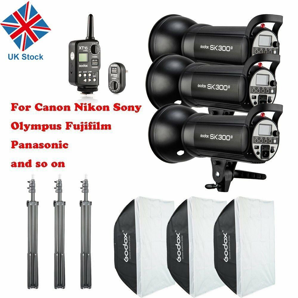900W UK 3x Godox SK300II Studio Strobe Flash Light Head +Trigger+Softbox f Canon