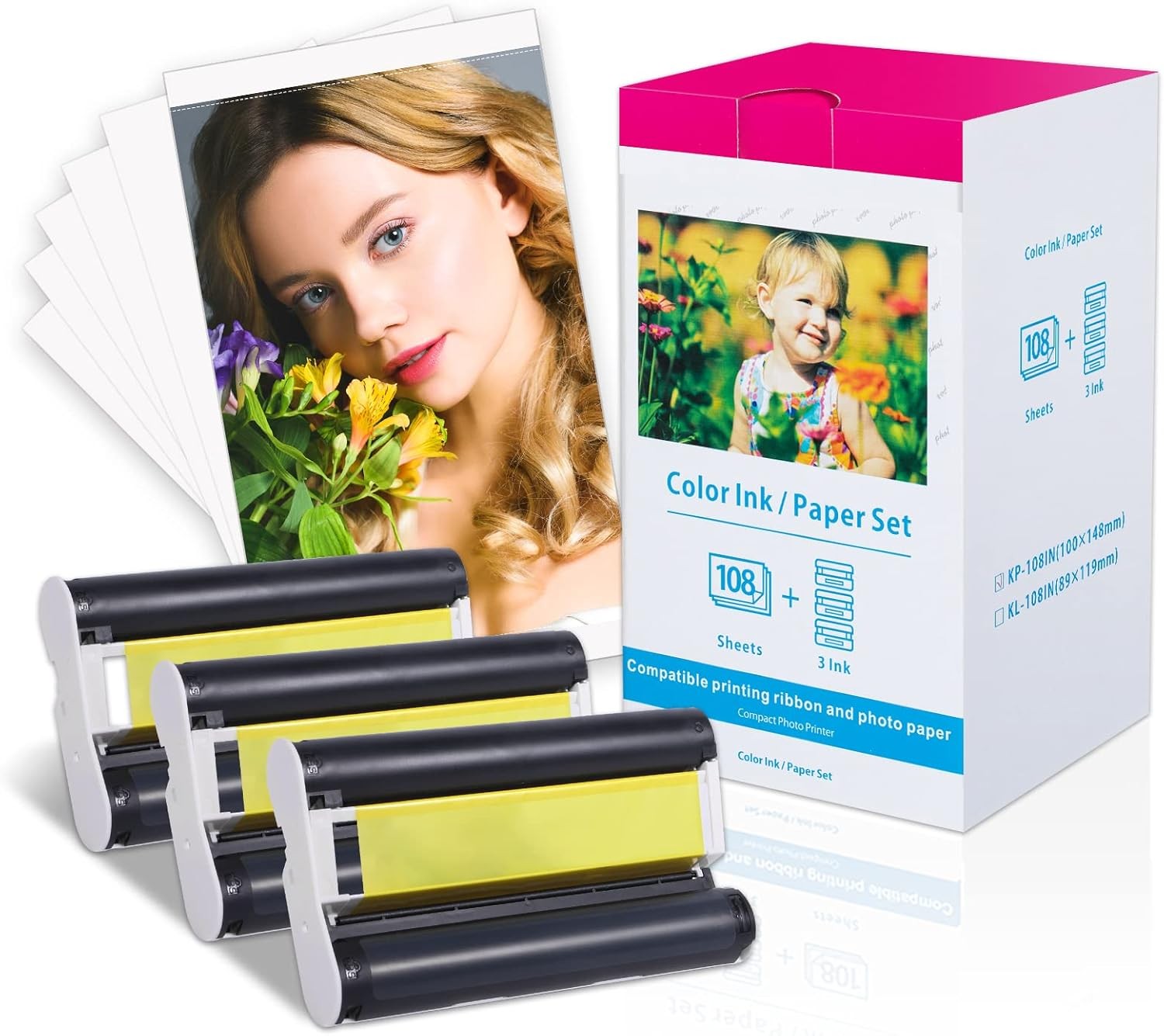 Compatible for Canon Selphy CP1500 CP1300 Ink and Paper KP-108IN KP108IN 4x6 Compatible with Cannon CP CP910 CP1200 CP780 CP810 CP760 CP740 CP1000 Printer 108 Sheets Photo Paper 3 Ink Cartridges