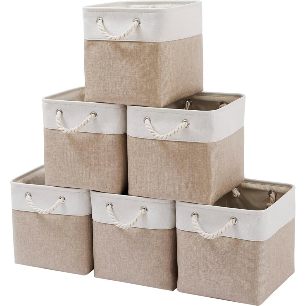 Canvas Storage Boxes 30cm Cube Bins Set Of 6, Fabric Baskets Cotton Rope Handles For Organizing Clothes, Khaki/White