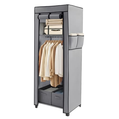 GREENSAPPIRE Canvas Wardrobe 161 * 59 * 45cm – Portable Fabric Wardrobe for Bedroom, New Base Design with 2 Storage Boxes & Side Pockets, Ideal for Home, Apartment & Dormitory (Grey)