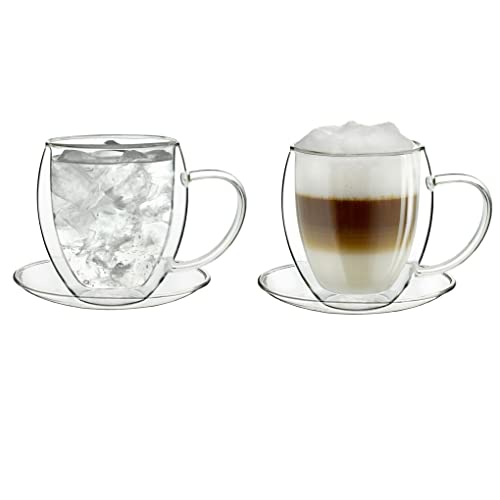 Creano Double Walled Coffee Glasses with Handle & Saucer 250ml - Insulated Cappuccino Cups - Latte Macchiato, Tea - Handmade Heat Resistant Mugs - 2 pcs (Pack of 1)
