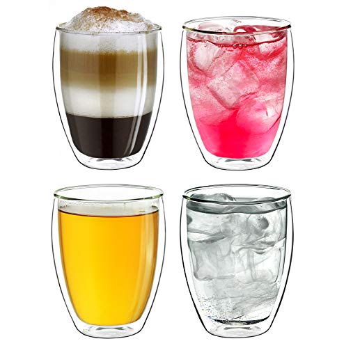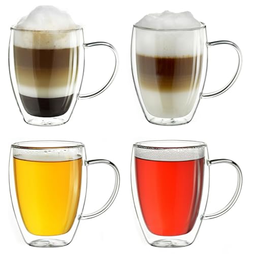 TKNO Set of 4 Double Walled Coffee Glasses Mugs Cappuccino Latte Macchiato Glasses Cups with Handle, Borosilicate Heat Resistant Glass Cups for Coffee Tea Milk Juice Ice Cream, Hot & Cold Drinks 350ml