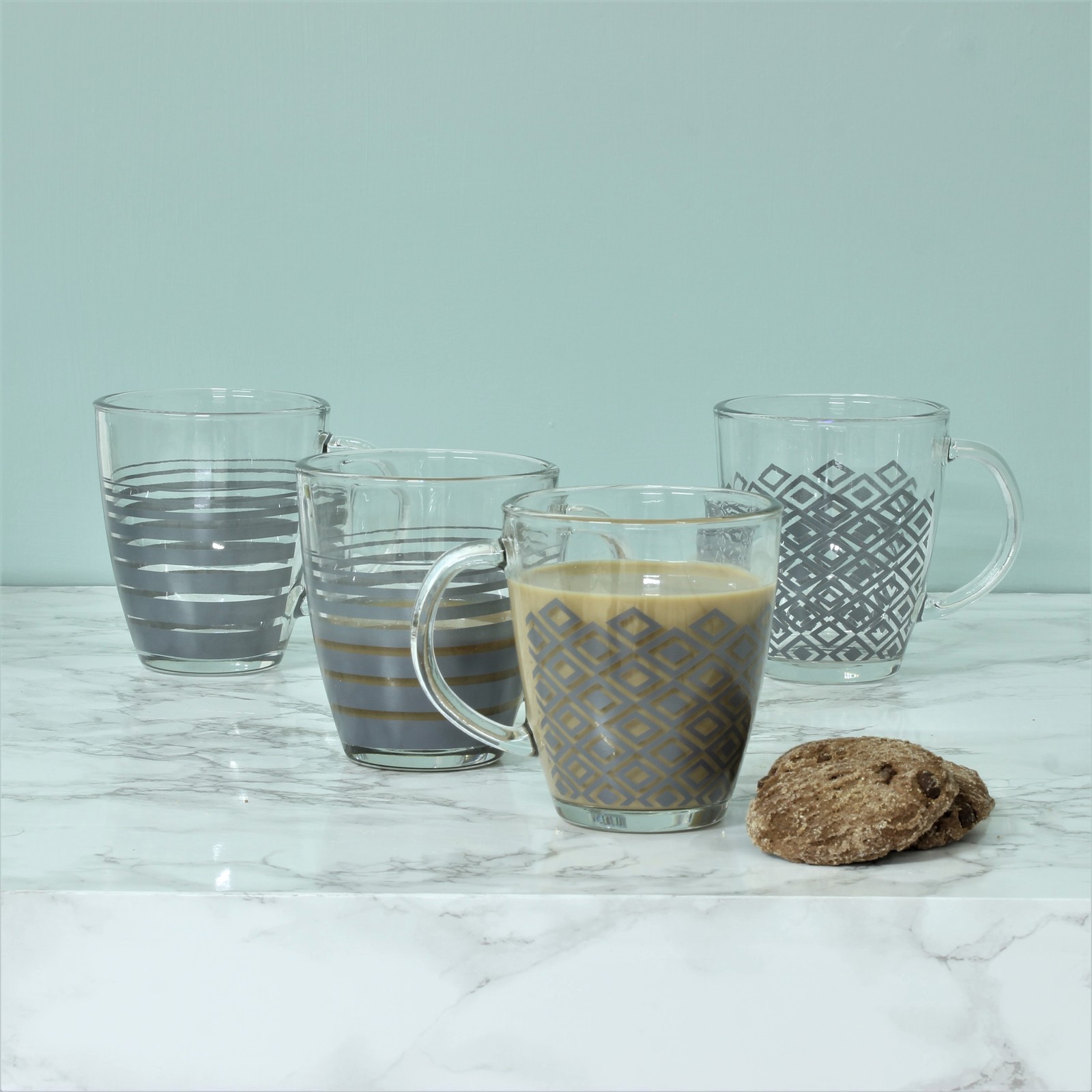 Set of 4 12oz Assorted Patterned Design Clear Glass Coffee Cappuccino Tea Mugs