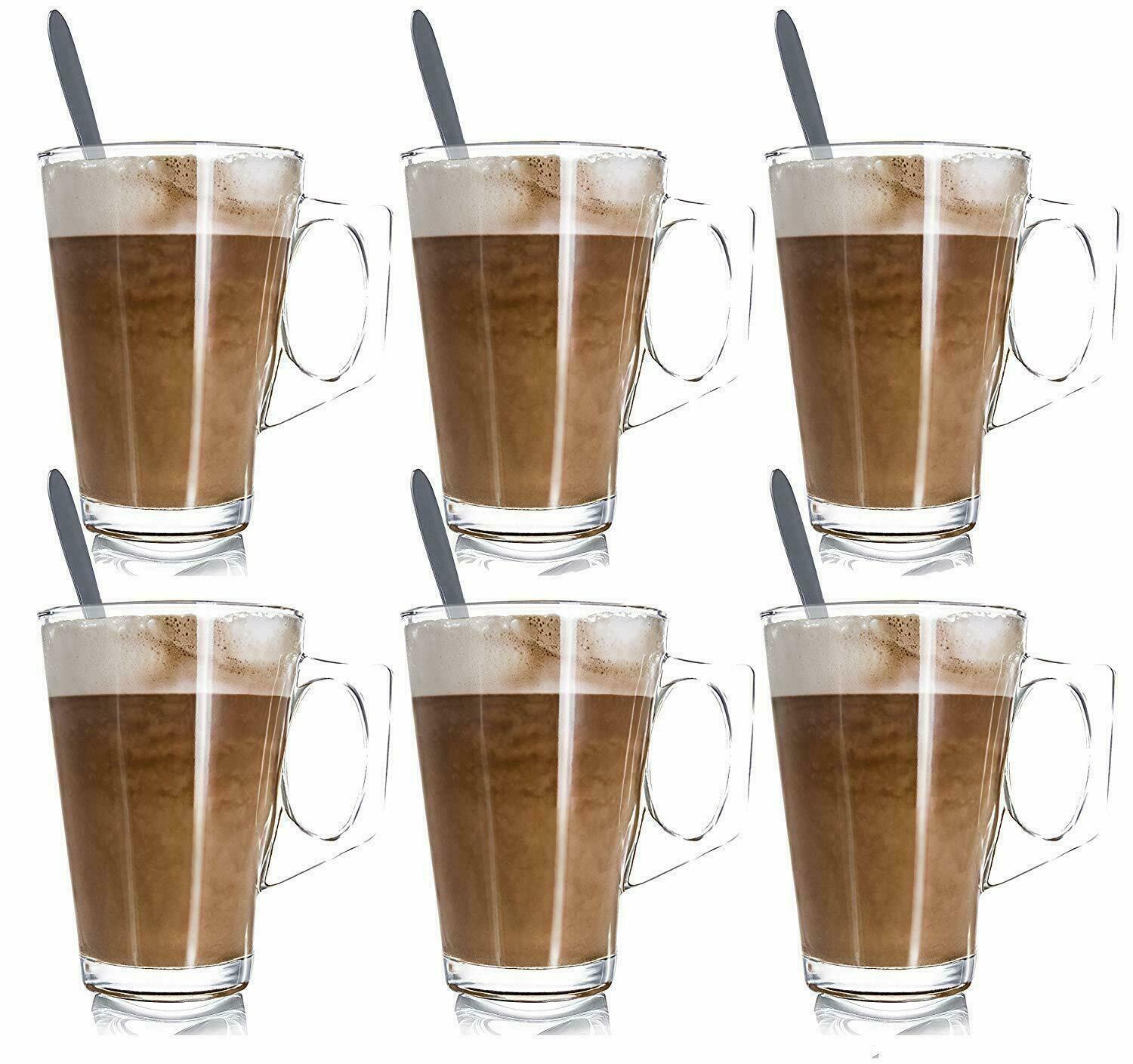 6 X Latte Coffee Mugs Cappuccino Tea Glass Cups Hot Drink Free Spoons