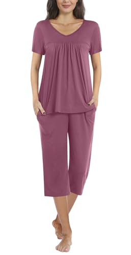 Womens Summer Pleated Pajama Sets Short Sleeve Sleepwear Ladies Nightwear Capri Pants Pjs Lounge with Pockets