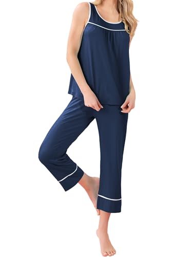 Famulily Summer Pyjamas for Women Two Piece Nightwear Tank Tops and Capri Pants Ladies Pajamas Set Piping Sleepwear Pjs Sets with Pockets Navy M