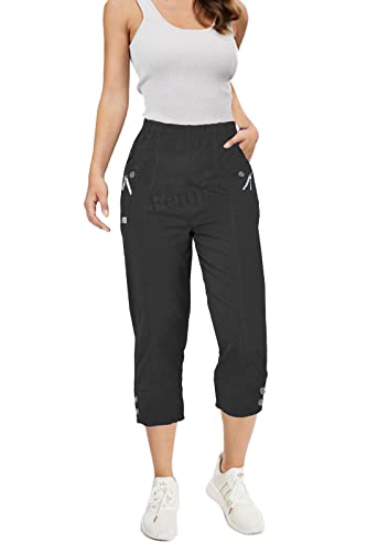 AIGOUT Women Linen Cropped Trousers with Elasticated Waist Ladies Wide Leg Trousers with Pockets, Baggy Capri Pants Summer Solid Casual Work Trousers Beach Pants Loose Fit Track Lounge (Black, S)