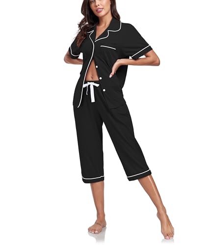 COLORFULLEAF Women's 100% Cotton Pyjama Sets Capri Lounge Set Short Sleeves Top & Cropped Legs Pants Loungewear with Pockets(Black,XL)