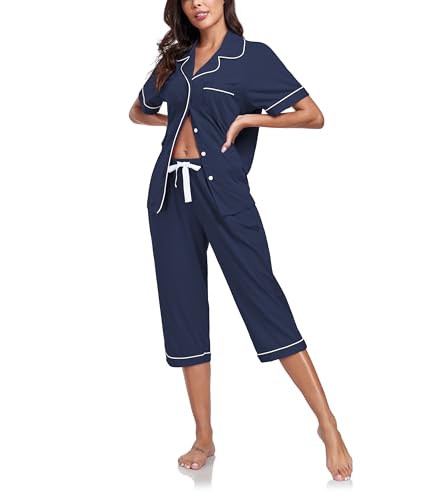 COLORFULLEAF Women's 100% Cotton Pyjama Sets Capri Lounge Set Short Sleeves Top & Cropped Legs Pants Loungewear with Pockets(Navy Blue,S)