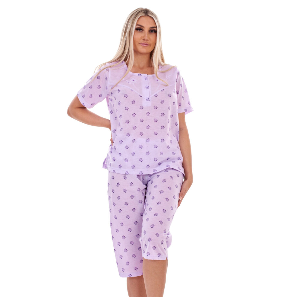 (Lavender, M) Malay Ladies Capri Pyjama Set Floral Printed Crew Neck Buttons Cropped PJs M to XXL