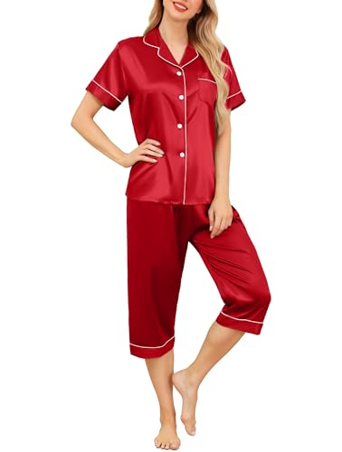Vlazom Women's Pyjamas Sets, Silk Pj's Set Short Sleeve Button Down Top and Capri Lounge Set Soft Satin Loungwear Sleepwear A-Wine Red,L