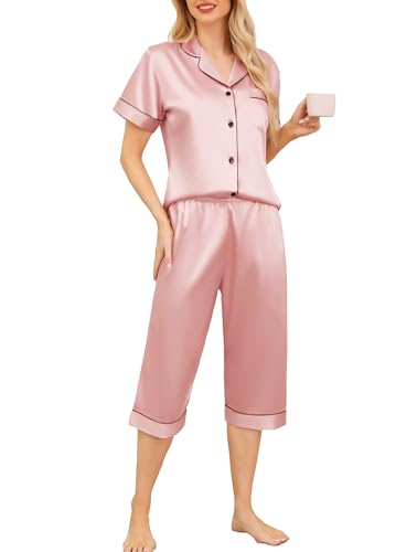 Vlazom Women's Pyjamas Sets, Silk Pj's Set Short Sleeve Button Down Top and Capri Lounge Set Soft Satin Loungwear Sleepwear A-Light Pink,M