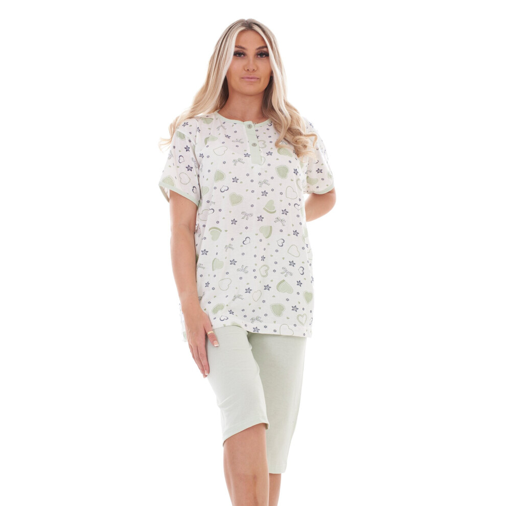 (Light Green, 4XL) Malay Plus Size Capri Pyjama Set Heart Printed Short Sleeve Buttons Cotton 4XL to 6XL