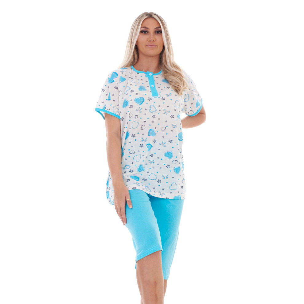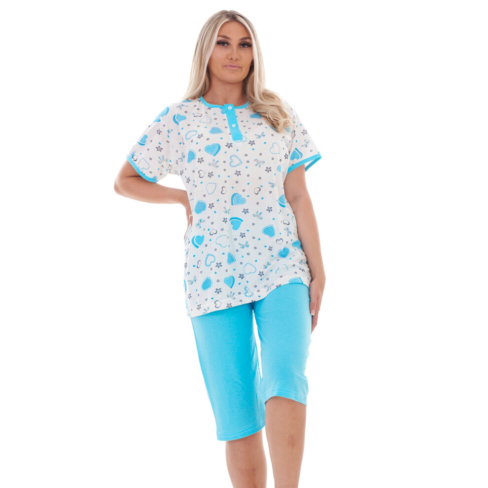 (Turquoise, 4XL) Malay Plus Size Capri Pyjama Set Heart Printed Short Sleeve Buttons Cotton 4XL to 6XL
