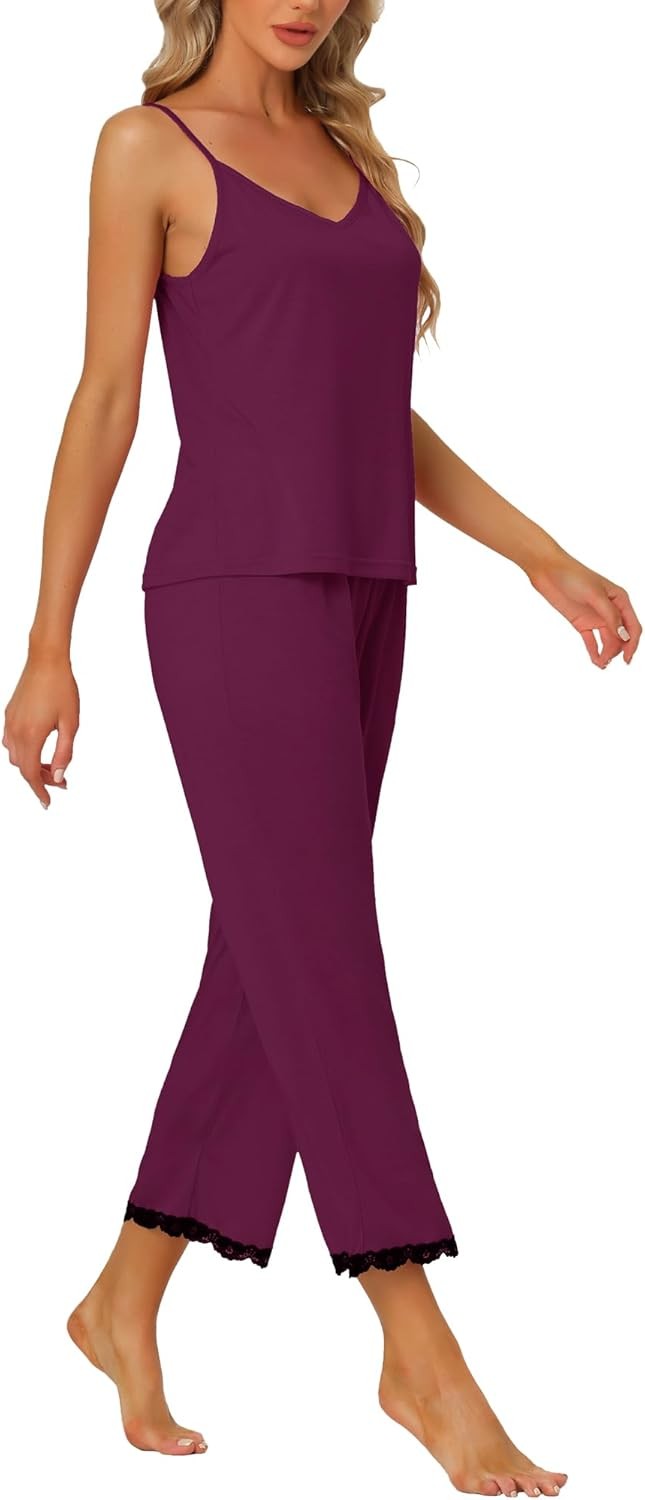 cheibear Womens Cami Top and Capri Pajama Set Soft Modal Lace Trim Loungwear Sl