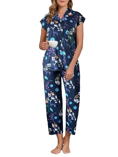 Famulily Pajamas for Women 2Pcs V Neck Cap Sleeve Top and Wide Leg Capri Pants Pjs Set Loungewear Navy S