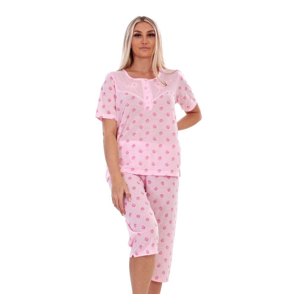 (Pink, M) Malay Ladies Capri Pyjama Set Floral Printed Crew Neck Buttons Cropped PJs M to XXL