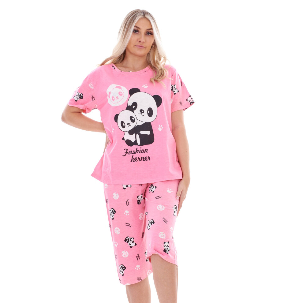 (Pink, L) Malay Ladies Capri Pyjama Set Animal Printed Panda Teddy Short Sleeve Nightwear