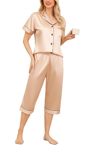 Vlazom Women's Pyjamas Sets, Silk Pj's Set Short Sleeve Button Down Top and Capri Lounge Set Soft Satin Loungwear Sleepwear Champagne,XL