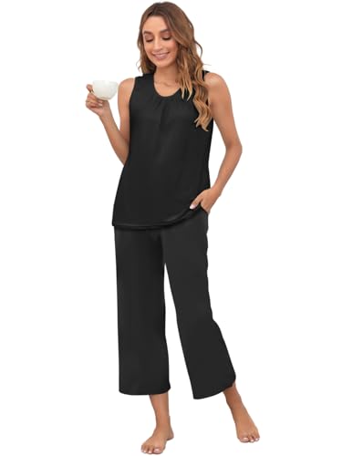 Famulily Pyjamas for Women Tank Top Pajamas Set Capri Pants Floral Print Summer Pjs Black L