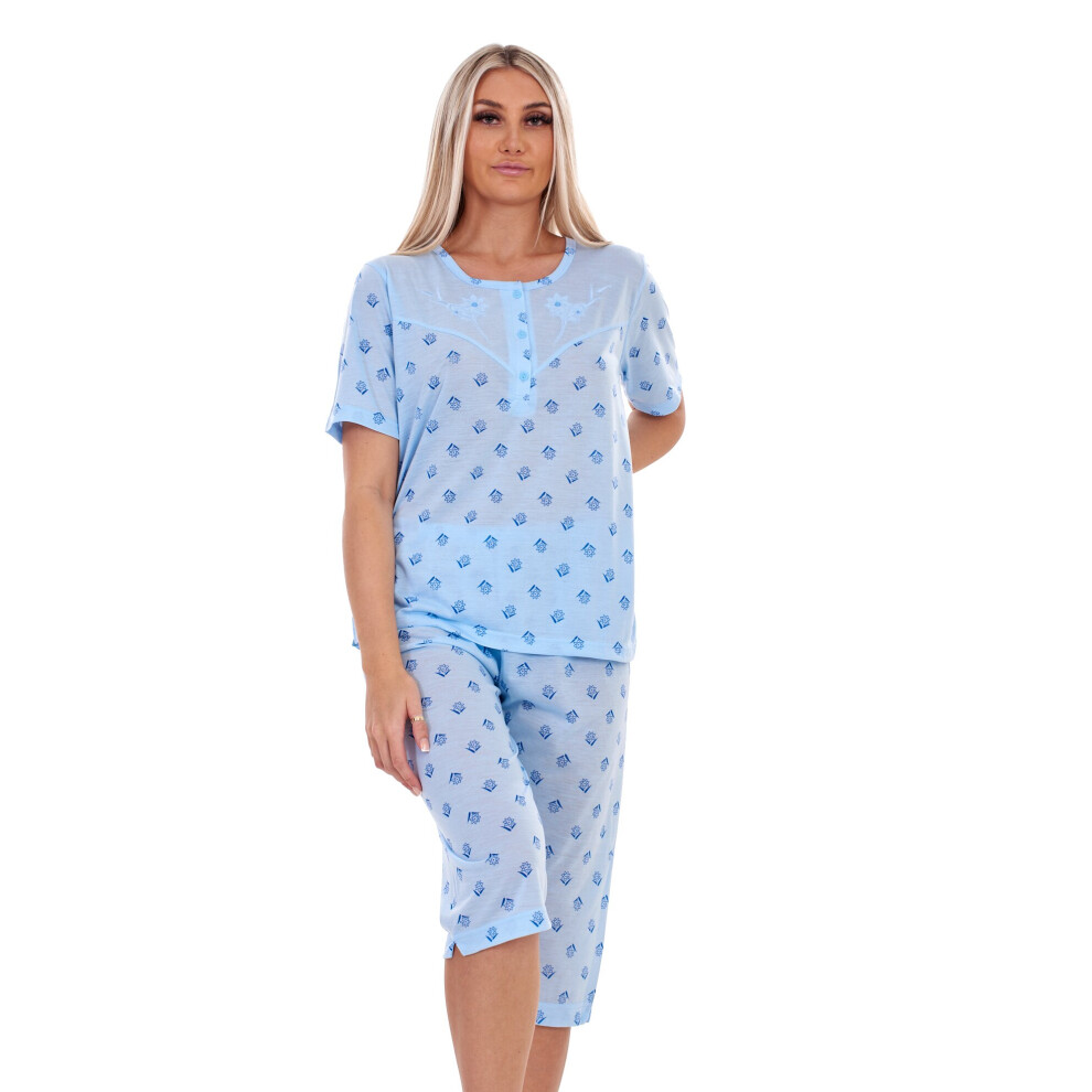 (Blue, M) Malay Ladies Capri Pyjama Set Floral Printed Crew Neck Buttons Cropped PJs M to XXL