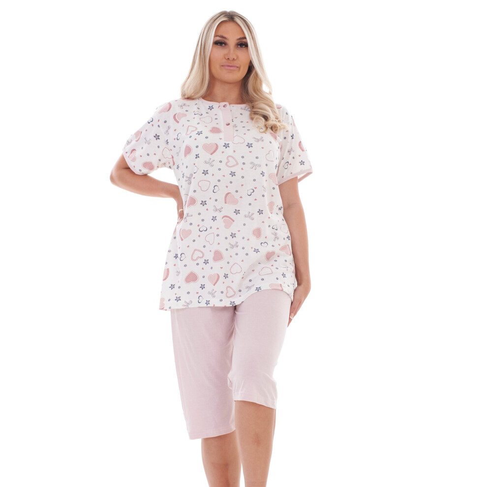 (Pink, 4XL) Malay Plus Size Capri Pyjama Set Heart Printed Short Sleeve Buttons Cotton 4XL to 6XL