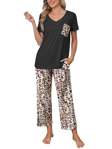 Famulily Womens Pyjamas Sets Short Sleeve V-Neck Nightwear Tops and Wide Leg Capri Bottoms Pjs Set Casual Loungewear Outfits with Pockets Leopard M