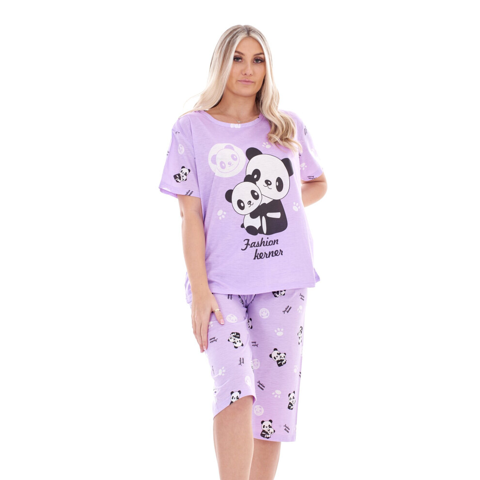 (Lavender, L) Malay Ladies Capri Pyjama Set Animal Printed Panda Teddy Short Sleeve Nightwear