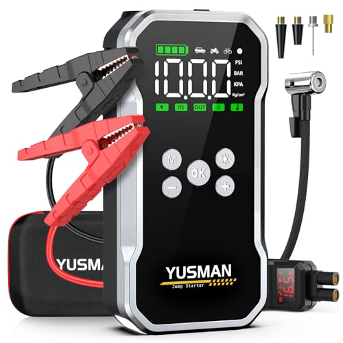 Jump Starter Power Pack with Air Compressor, YaberAuto 6000A Portable Car Battery Booster (All Petrol/10L Diesel), 12V Car Jump Starter Power Bank with Jump Leads, LCD Screen, Emergency Light