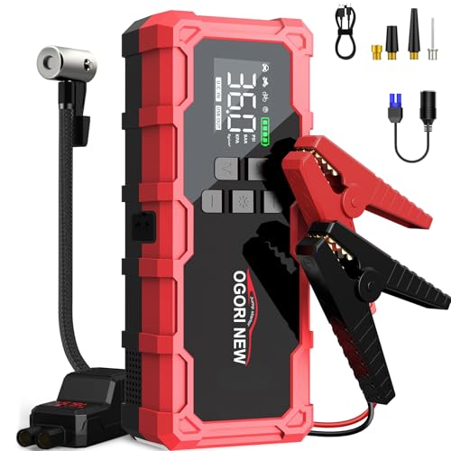 Jump Starter Power Pack 8000A, Car Battery Booster Starter with Tyre Inflator,12V Car Jump Starter with Flashlight,Large Screen,Jump Leads (10.0L Gas/8.0L Diesel)