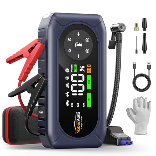 Jump Starter Power Pack with Air Compressor 150PSI, YaberAuto 4500A Car Battery Booster Jump Starter for 9L Gas/8L Diesel, Car Starter Power Bank with Jump leads, Insulated Gloves, 500 Lumens