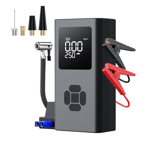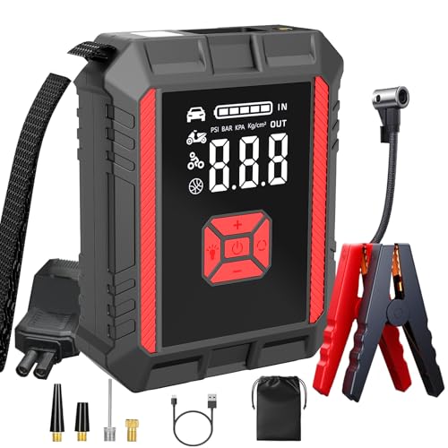 Jump Starter Power Pack with Air Compressor 150PSI - Portable Car Battery Booster for All Gas/10L Diesel Engines, Jump Leads LCD Display & Emergency Flashlight, Black