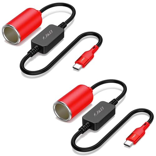 J&D 12V Car Cigarette Lighter Socket with USB Ports, Male to Female, 18W High-Speed Charging for Multiple Devices, Compatible with Dash Cams, GPS, LED Strips, 2-Pack, Red, 30 cm