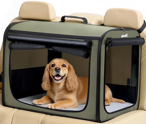 pecute Lightweight dog car carrier, easy to assemble dog car carrier, portable ventilated dog car crate, foldable indoor and outdoor pet carrier, green dog travel crate with curtain.